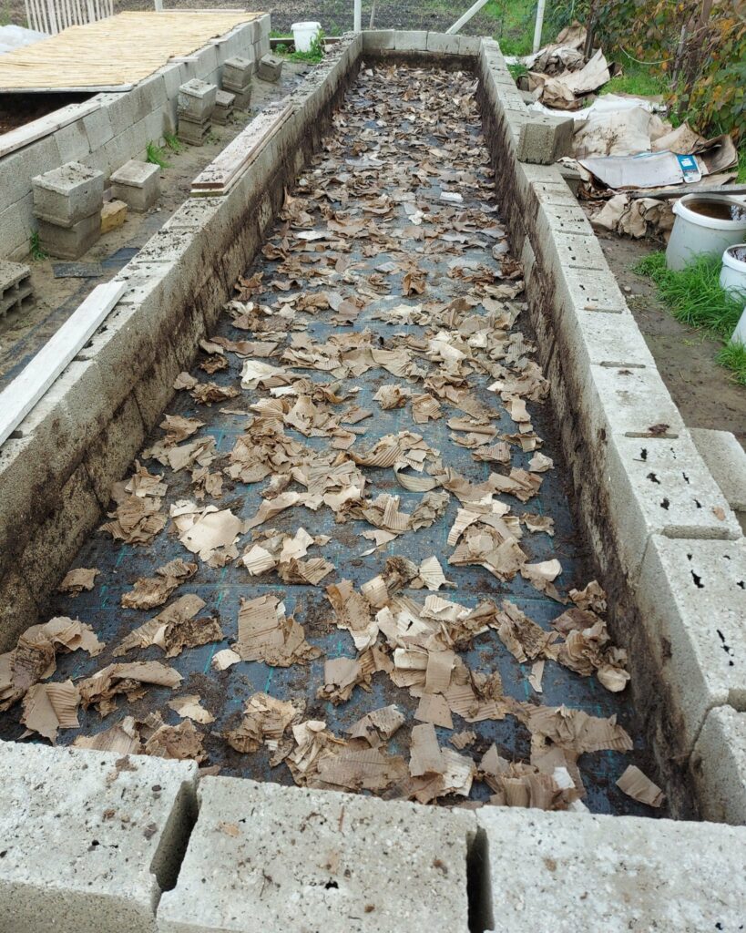 3) Ogradili ste bazen i vreme je da stavite hranu za gliste. Na dno bazena pobacajte grubo iscepkan mokar karton tako da skoro pokrije dno kao na slici. Nema potrebe da ga preterano sitnite jer će ga gliste vremenom preraditi. Karton služi kao tzv. “postelja” za gliste odakle će kretati da se hrane i gde će se razmnožavati dok ne prerade prvih 15-ak cm materijala. Preko kartona stavite sloj od 15 cm pregorelog stajnjaka koji je usitnjen i navlažen na nekih 80% (kad jako stisnete šakom da se cedi pak kapi tečnosti). Tu vlagu je potrebno da održavate stalno redovnih polivanjem po potrebi kad vidite da je materijal malo suvlji. Kad ste stavili i pregoreli stajnjak možete ubaciti gliste. Jedno mini leglo je najbolje ubaciti na 1m2 i ostaviti tako prva 4 meseca jer će se na manjem prostoru gliste češće susretati i brže razmnožavati. Posle 4 meseca možete ih podeliti na 2m2. Ako planirate uzeti jedno mini leglo napravite bazen od 2m2, pregradite pola nekom daskom i pustite gliste na 1m2. Posle 4 meseca podignite pregradu i gliste će same preći u ostali prostor. Podrazumeva se da tamo stavite i hranu u visini kolika je i delu u kome su bile. Ako ide zima, odložite podizanje pregrade za proleće jer je najbitnije da ih pravilno uzimite da prežive niske temperature. Kad ubacite gliste u bazen pokrijte površinu suvim kartonom kao na slici jer je on odličan termoizolator i čuva vlagu kad je vrućina. Istovremeno sprečava sunce i vetar da isuše gornji sloj i omogućava glistama da se u njemu hrane nakon što prerade hranu u donjim slojevima.