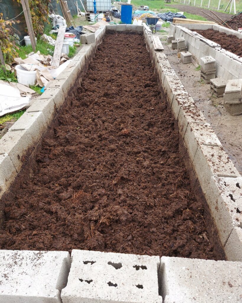 2) Nakon što ste ogradili mesto za bazen do visine od 40 cm (za ograđivanje možete koristiti blokove, daske, fosne, panele, cigle ili šta već imate pri ruci) bazen je spreman za naseljavanje glistama. Visinu možete podešavati tako da dodajete ili skidate ogradu jer ćete na taj način moći da određujete koliko dugo da hranite gliste. Iz mog iskustva, betonski blokovi 19*19*39 cm koji su u ponudi najbolje su se pokazali kao termoizolator i lako je baratati s njima. Cena im je po stovarištima oko 1 euro po komadu, a kad ih jednom kupite trajaće vam praktično večno. Slažete ih naopačke da se ne pune vodom. Negde sam video da ih slažu tako što šupljine pune slamom kao dodatnom termoizolacijom ali to je već previše posla pa ko želi može i to da uradi.